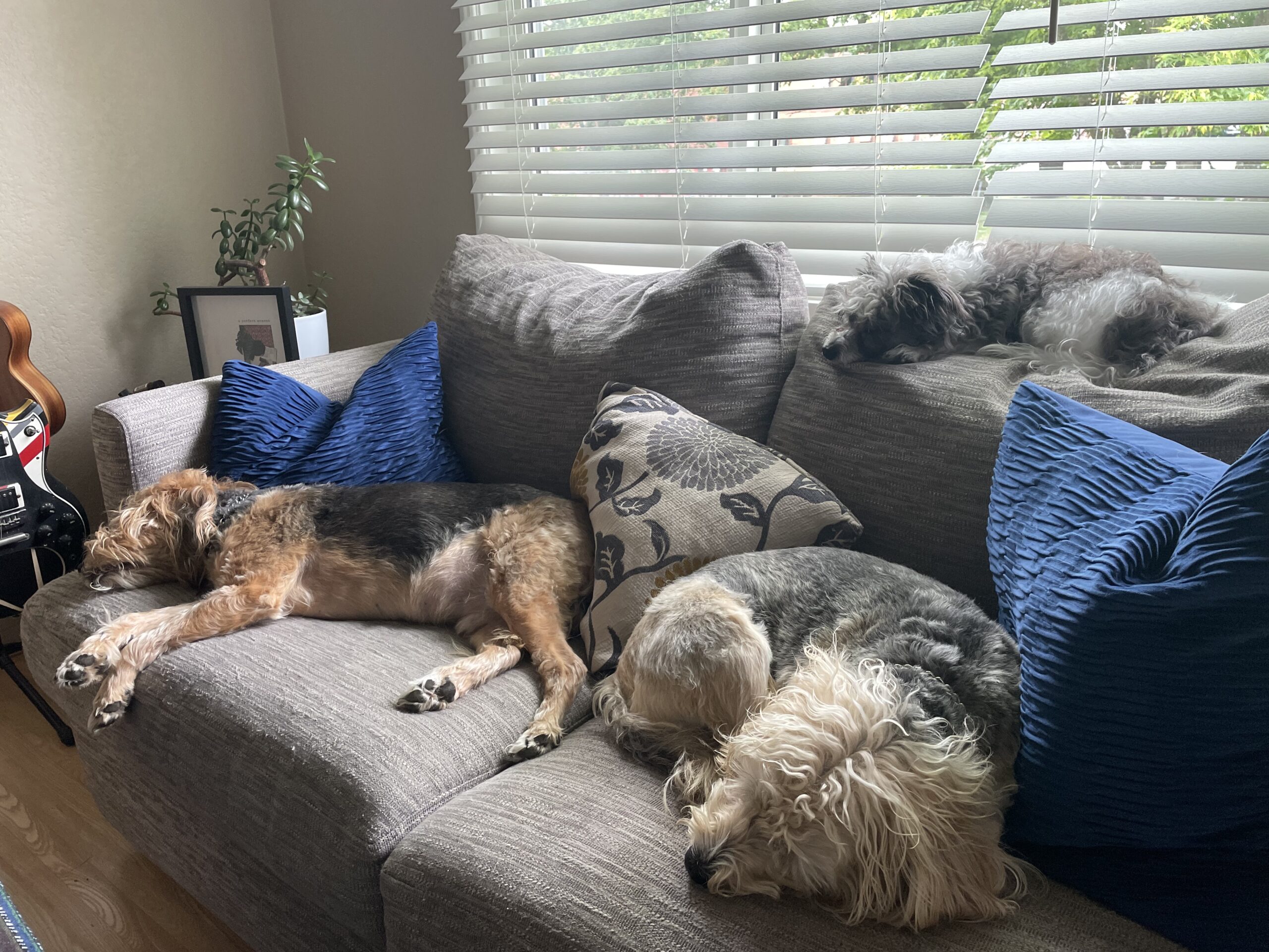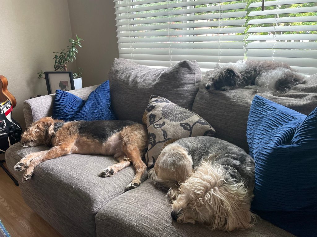 On her last week, she stopped eating including all her favorite things that we tempted her with. On her last day and night, she slept peacefully on the mat in our downstairs bathroom. We held vigil throughout the night. The next morning Eric took her to the Vet where she took her journey over the Rainbow Bridge. He was devastated. Shattered. And vowed never to do that again. It felt like murder. Completely irrational, we know. But that’s how it felt. Don’t judge. And please, no platitudes about putting an end to her suffering. We get that. We aren’t selfish morons. Just brokenhearted dog lovers.