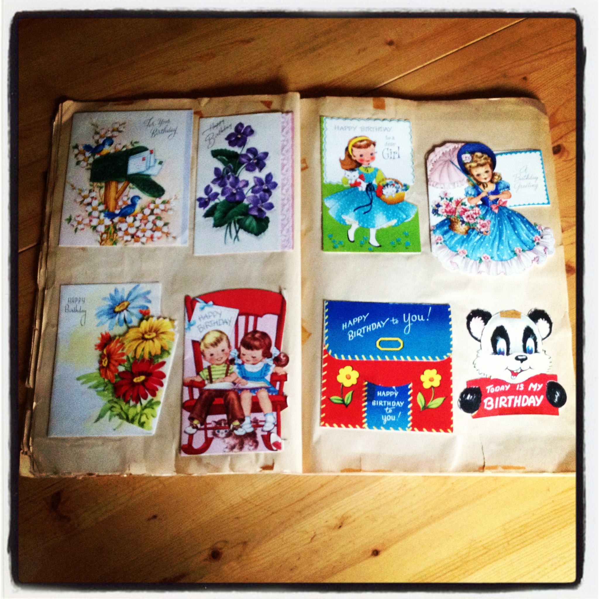 At the precise hour indicated on the invitations my guests arrived, each carrying a beautifully wrapped gift with a card taped to the top. Ma greeted everyone amiably, collected their gifts, and set them aside on the coffee table for later. Once everyone was gathered, the games began. Drop the clothes peg in the milk bottle. Pin the tale on the donkey. Musical chairs. Simon says. Bingo! Such fun! We giggled and cheered. We clapped and chuckled. Then it was time to open the presents. One by one. Oohs and ahhs. Always a thank you after each one. Ma saved all their precious birthday cards. I still have the first decade’s worth taped inside the pages of the old Scrapbook Ma made for me. Tattered and torn. Kittens and yarn.