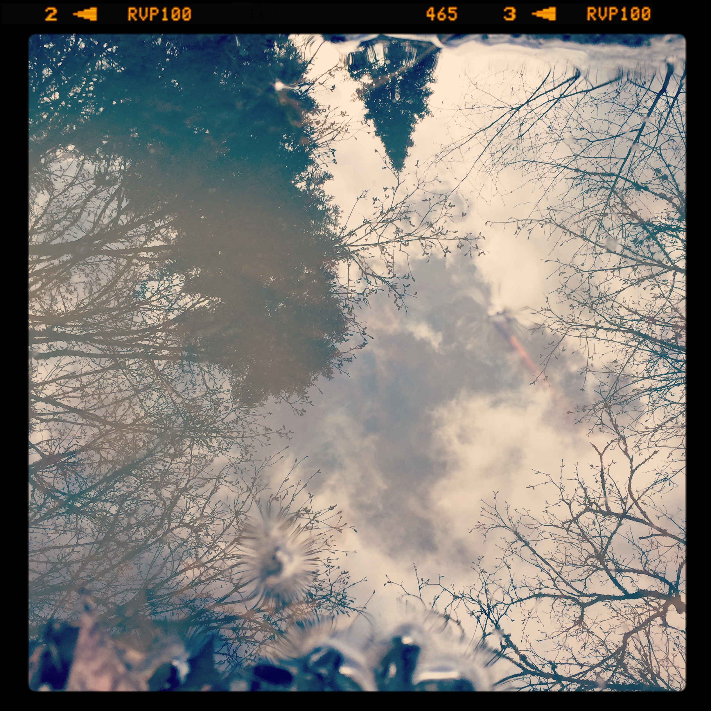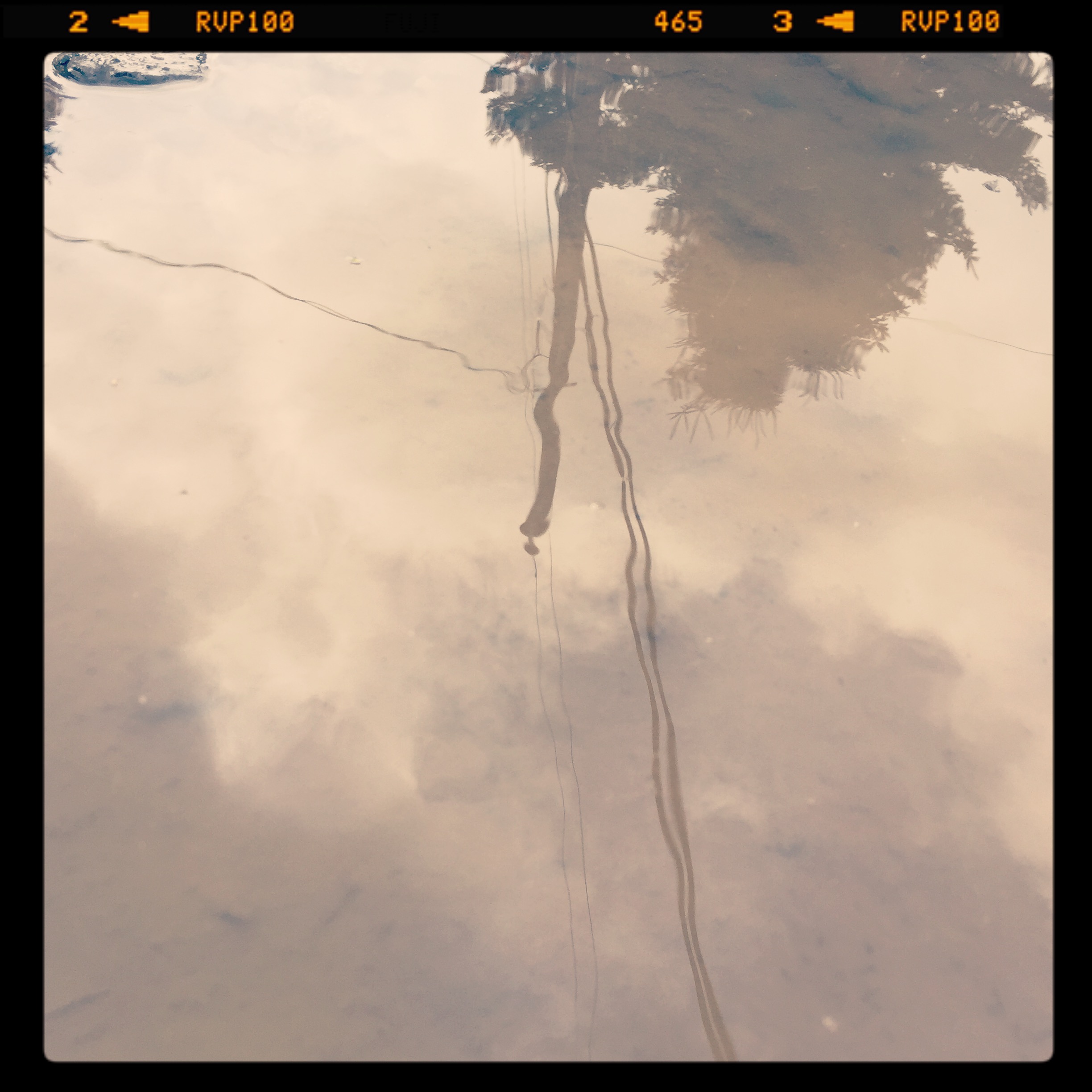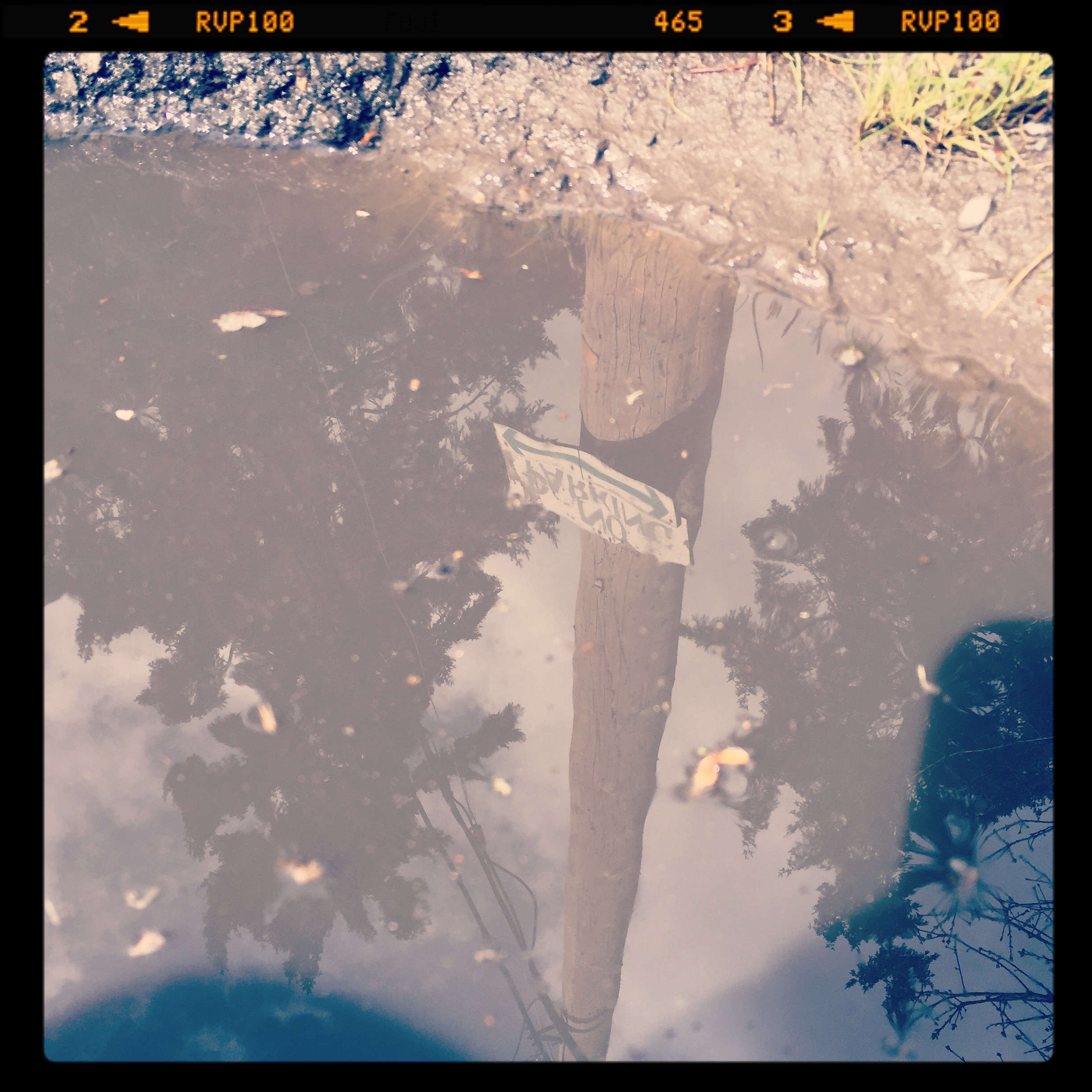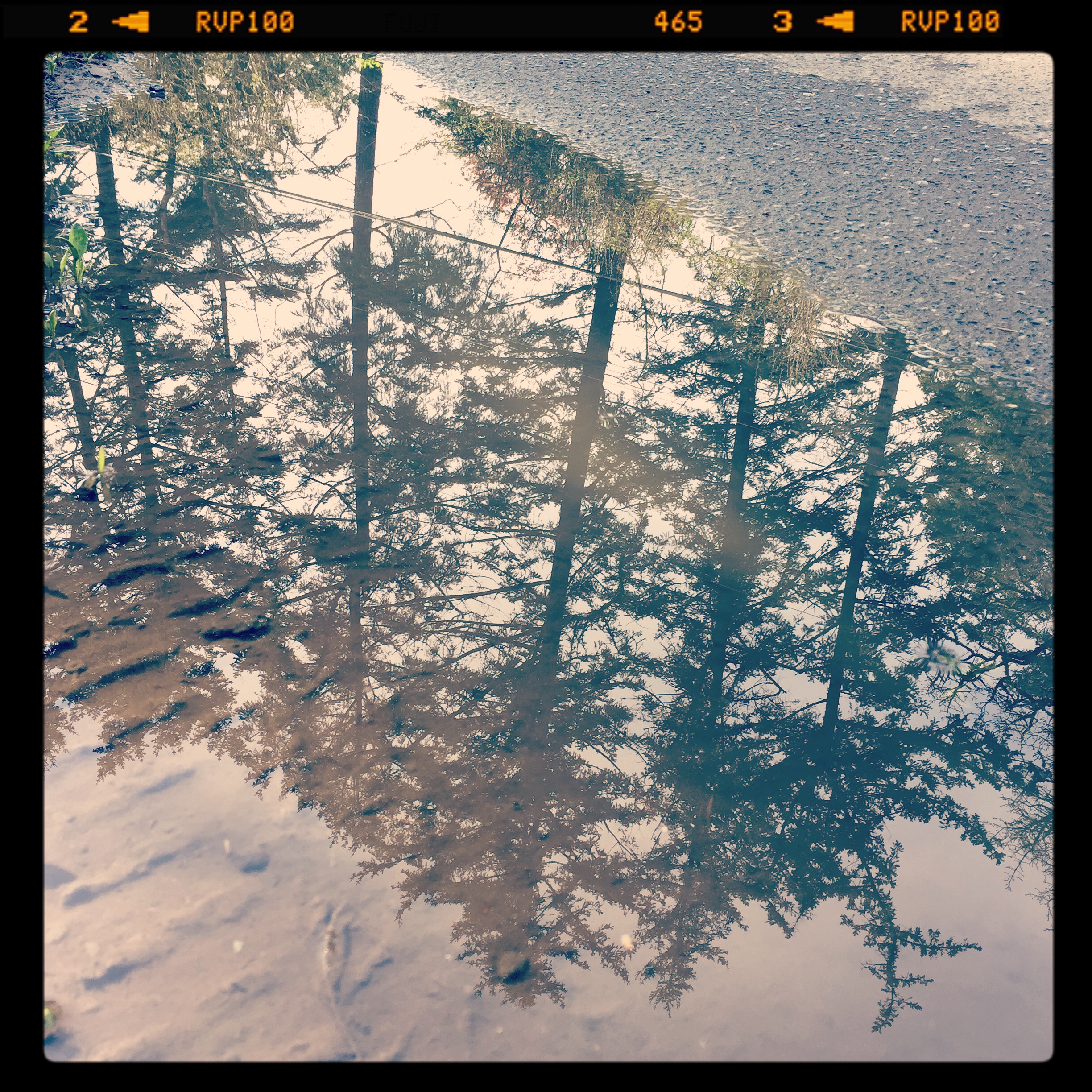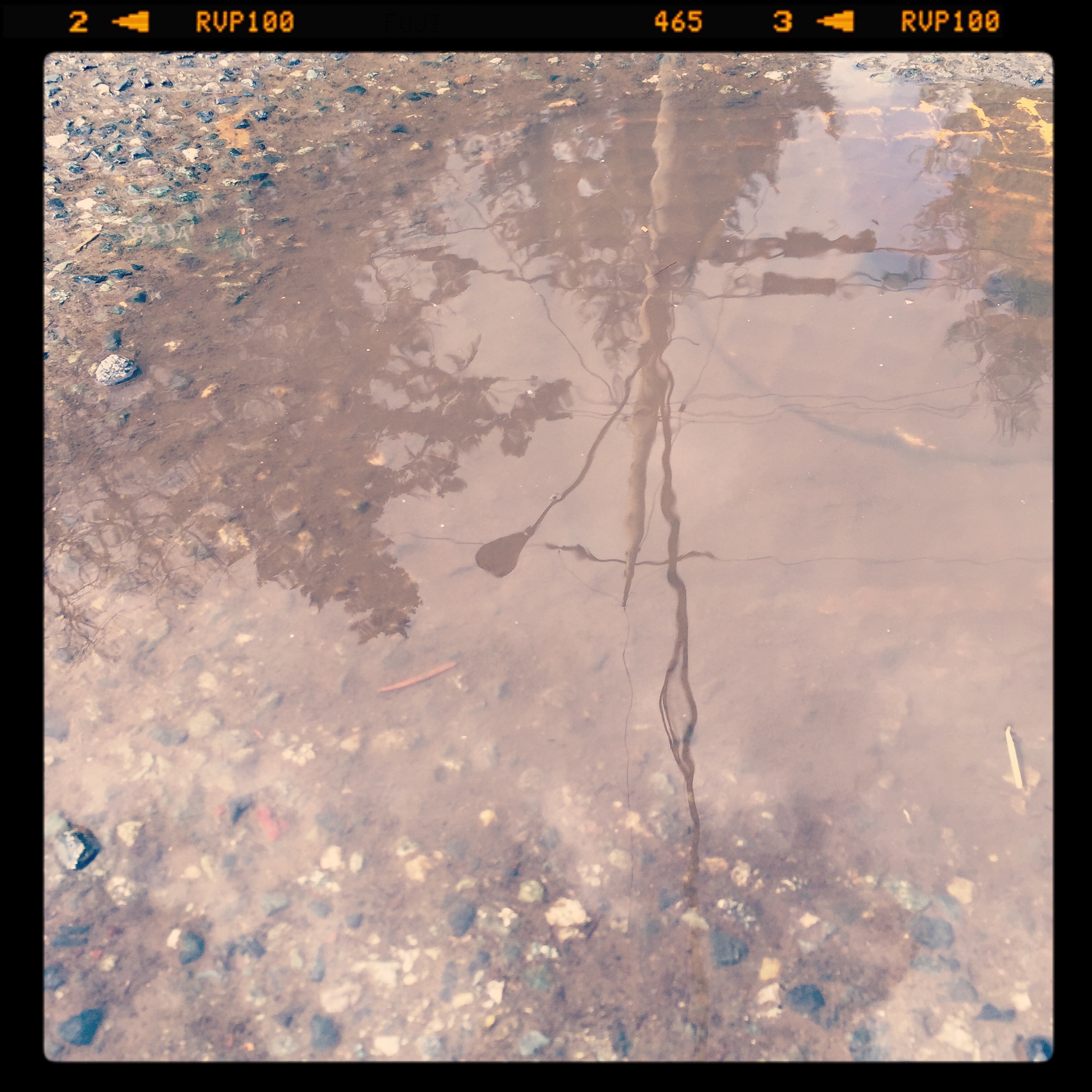 In the past month, I have sought out muddle puddles. They have brought new meaning, joy and wonder to my lunchtime walk. I’m the crazy lady crouched on the ground snapping photos on my iPhone of these fascinating little pools of dirty water. The smallest one I’ve photographed was about six inches, the largest about six feet long. I feel like Alice in Through the Looking Glass peering into another world filled with magic and all things curious. Everything is distorted. Depth perception is challenged. Shallow one second. And bottomless the next: like I could easily fall in and be lost forever in the shimmering darkness. Seeing such gigantic things like trees and telephone poles reflected and held so spellbindingly inside something so small. The juxtaposition takes my breath away.