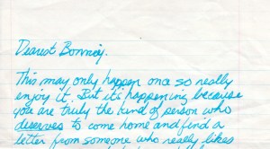 It began “Dearest Bonney.”  You could tell that the writer had corrected the spelling of my name because the dot over the misspelling was still there.  I hadn’t spelled my name with an ‘ie’ since grade eight.  But this only added to the sweetness of the salutation.  The letter went on to say, “This may only happen once so really enjoy it.  But it’s happening because you are truly the kind of person who deserves to come home and find a letter from someone….”  The rest is between me and Jerry.  It was (and still is) the best letter I have ever received in my entire life.  I hold it amongst my dearest possessions.